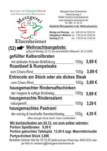 Unsere "Angebote für die Weihnachtswoche" -solange Vorrat reicht- Vorbestellungen bitte bis Freitag 19.12. abgeben. |